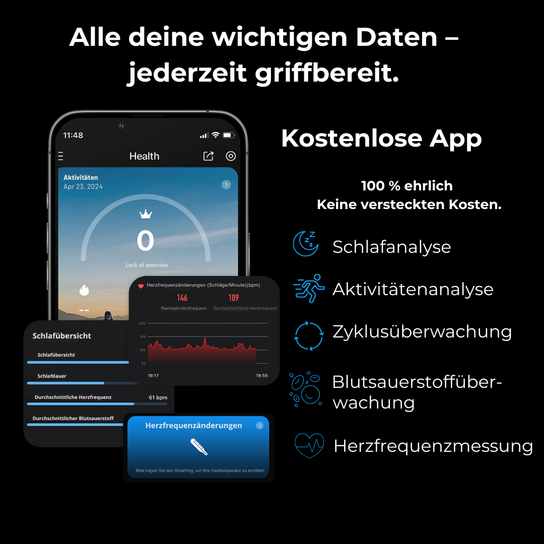 Kostenlose App für Schlaftracking, Aktivitätsanalyse, Zyklusüberwachung, Blutsauerstoff & Herzfrequenz – ohne versteckte Kosten.